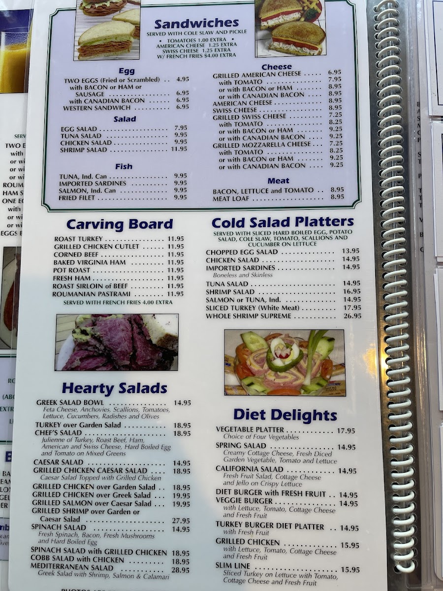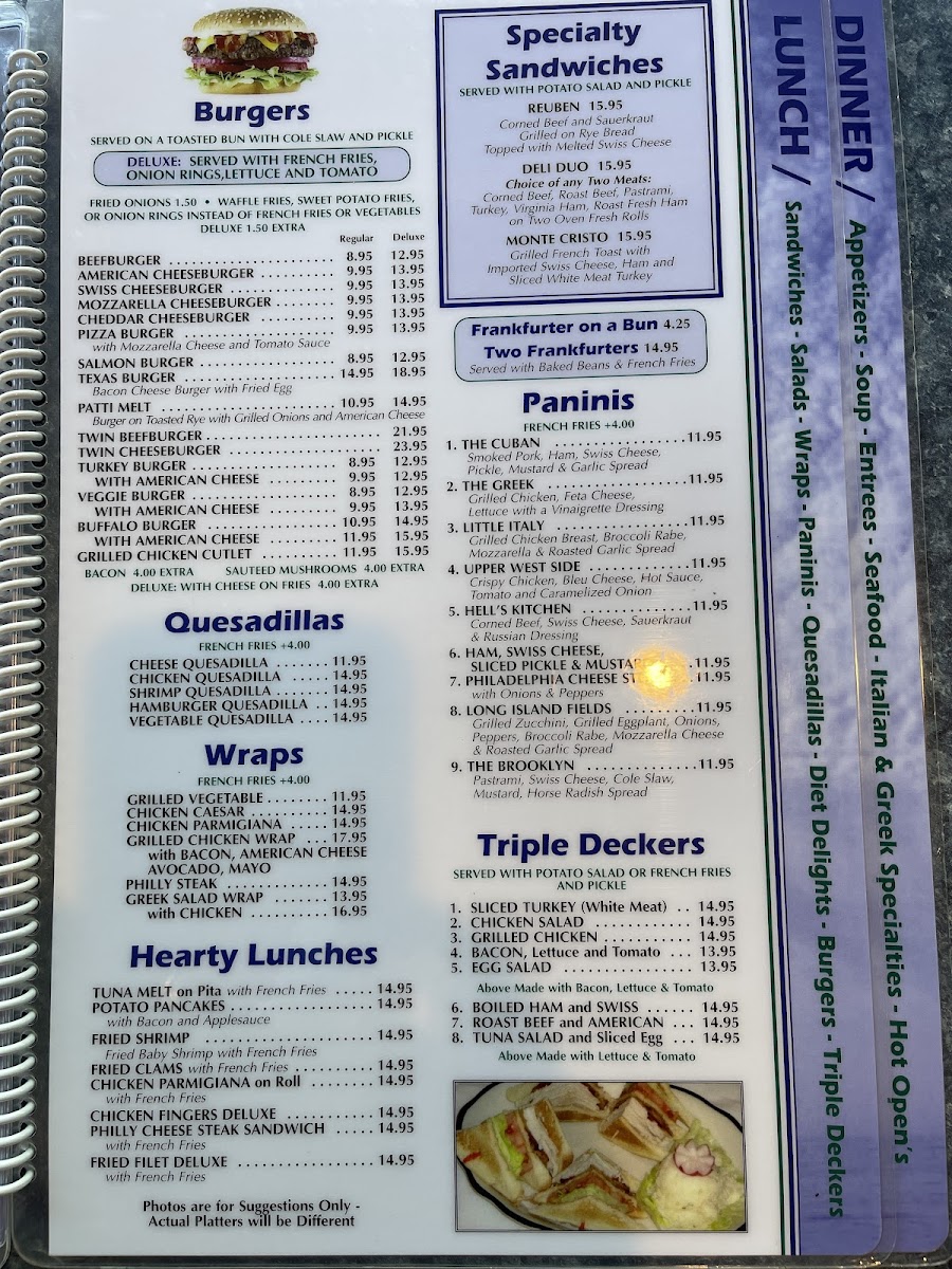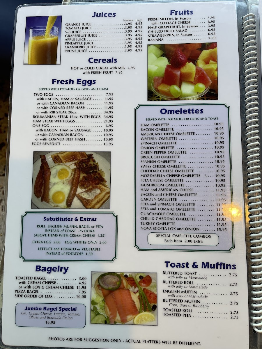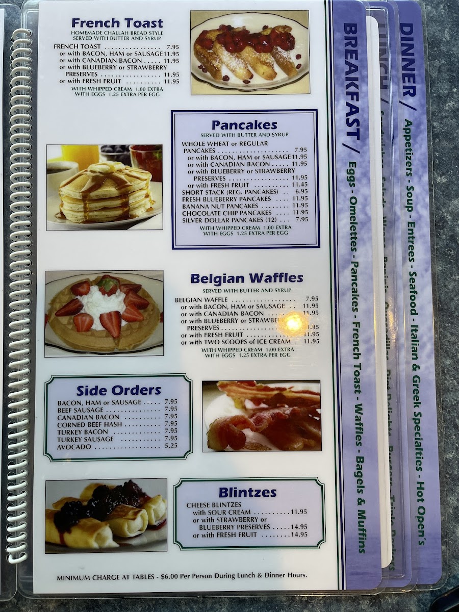 The menu at New Hyde Park Diner offers a variety of options primarily focused on classic diner and breakfast fare. Guests can expect a selection of breakfast staples, including French toast options such as Challah French Toast and French Toast with Bacon, various omelettes like the Spinach and Mozzarella Omelette served with home fries, as well as an assortment of burgers including the Bacon Cheeseburger and Cheese Burger Deluxe.