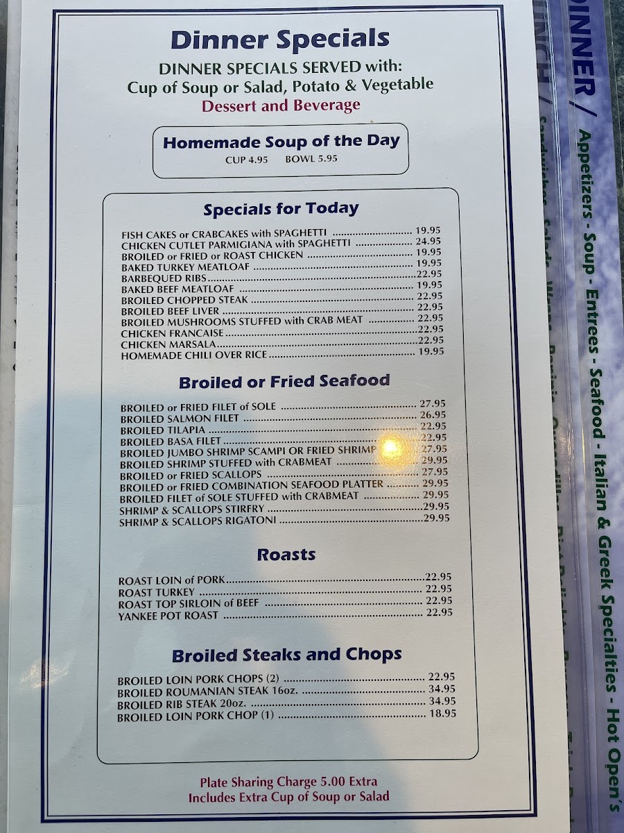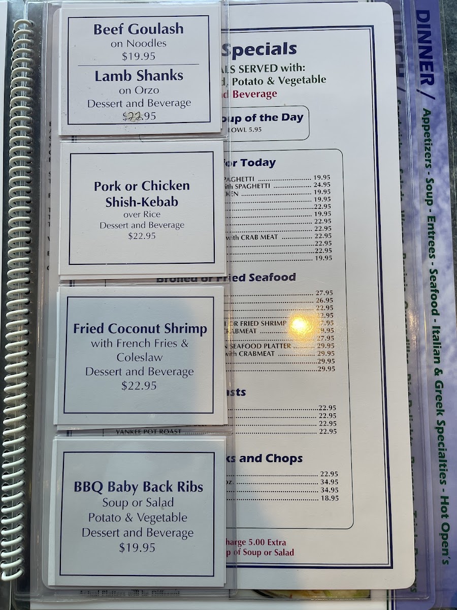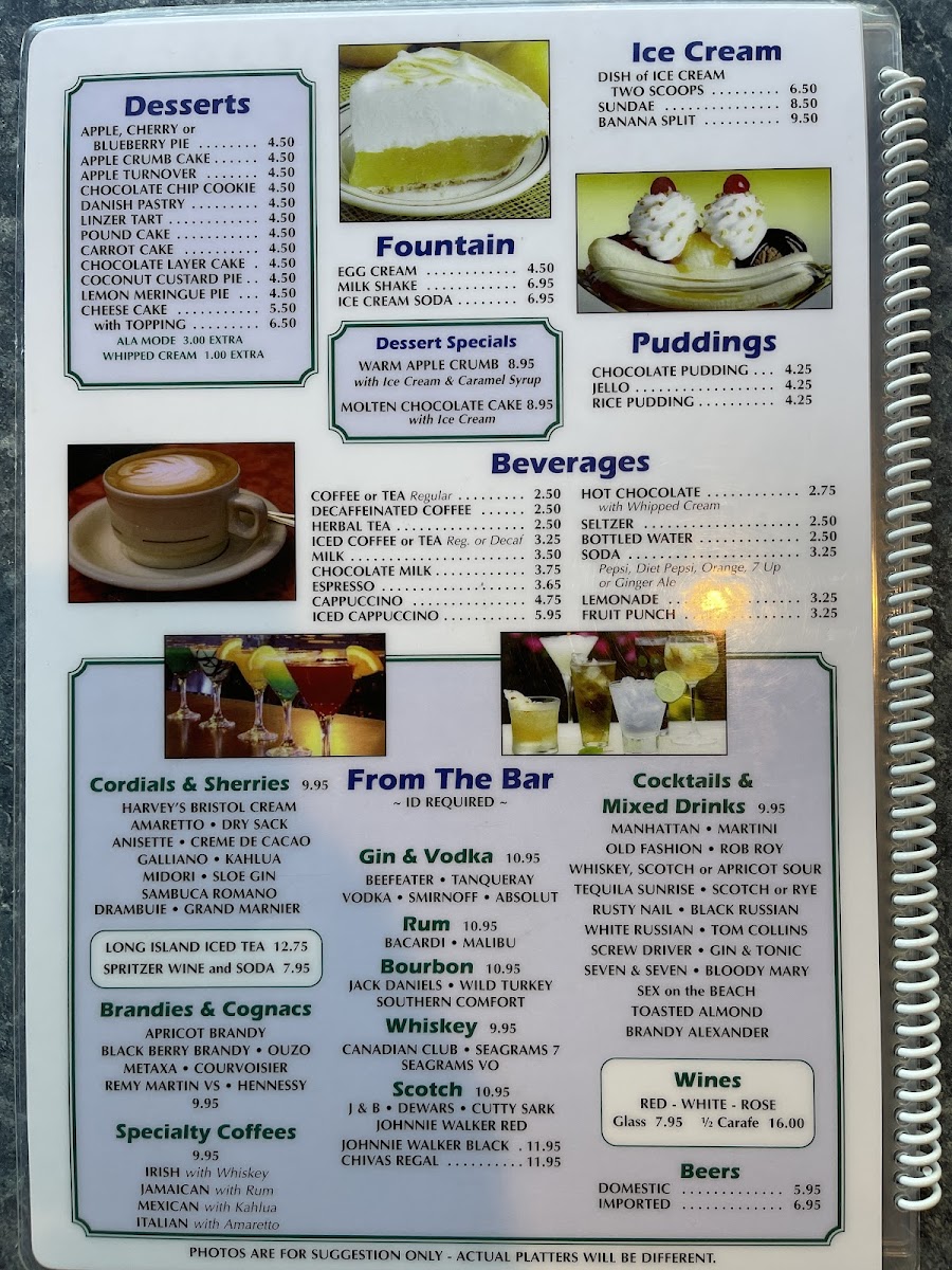In addition to breakfast and lunch items, the menu includes light meals such as Greek salad with grilled chicken on the side, homemade onion rings, and hot open turkey dinner. There is also a range of beverages to choose from, including coffee, tea, specialty coffees like Irish coffee with whiskey, and iced versions of coffee and tea. Beverage offerings extend to soft drinks such as lemonade, fruit punch, and bottled water, as well as adult beverages including cordials, sherries, and specialty mixed drinks like Long Island Iced Tea.